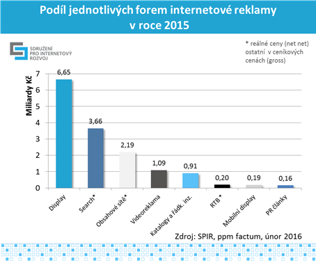 Největší část inzertních výdajů připadá na celoplošnou (display) reklamu (6,65 mld. Kč) a na reklamní sítě (5,85 mld. Kč) zahrnující reklamu ve vyhledávání (3,66 mld. Kč) a v obsahových sítích (2,19 mld. Kč). Ve srovnání s loňským objemem se u displeje jedná o 6% pokles, naopak u reklamních sítí (zahrnující sítě Sklik, AdWords, Facebook a eTarget) se jedná o 18% nárůst. Více než miliarda korun (1,09 mld. Kč) připadá na video (in-stream) reklamu, která si meziročně polepšila o 20 %.