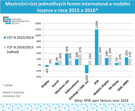 Stále více peněz zadavatelé směřují do video a mobilní reklamy na internetu. V posledních třech letech (od roku 2012) vzrostl výkon videoreklamy dvojnásobně na 1,09 mld. Kč a mobilní display reklama 2,5násobně na 189 mil. Kč. Do PR článků a inzerce v obsahu šlo 161 mil. Kč z inzertních rozpočtů. Objem mobilní reklamy pochází od zúčastněných médií a vypovídá o velikosti display inzerce na stránkách navštěvovaných z mobilních zařízení a v mobilních aplikacích.