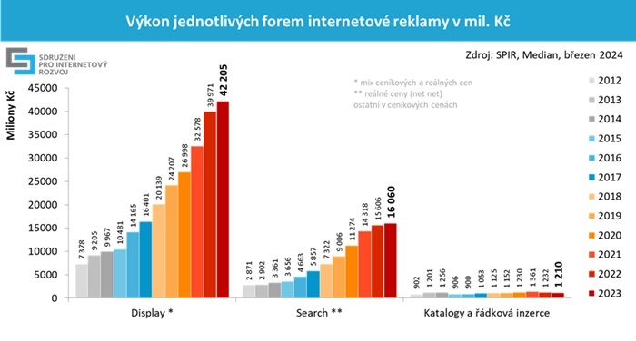 V roce 2023 dosáhly výdaje do online reklamy téměř 60 miliard korun a meziročně vzrostly o 5 %. Na růstu se v absolutních hodnotách nejvíce podílela display reklama (+6 %) a reklama ve vyhledávání (+3 %). Z pohledu způsobu obchodování inzertního prostoru rostl programatický nákup display reklamy o 7 %. Údaje pocházejí z výzkumu inzertních výkonů internetové reklamy, který pro Sdružení pro internetový rozvoj (SPIR) realizuje agentura Median.