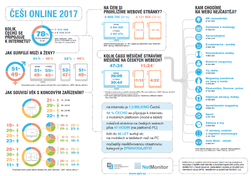 SPIR zároveň připravil infografiku na téma Češi online 2017, která názorně shrnuje internetové chování Čechů.