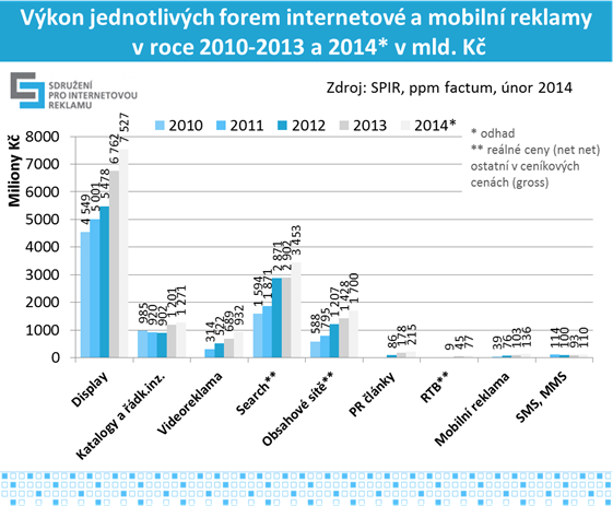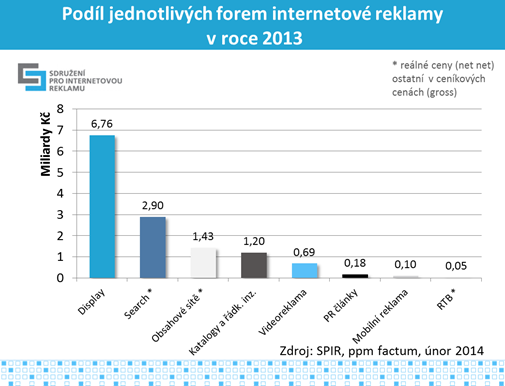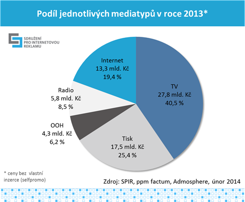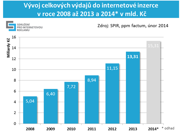 Internetová reklama zaznamenala v roce 2013 stejně jako v předchozích letech dvouciferný nárůst. Podle odhadu SPIR dosáhly loni inzertní výdaje do různých forem online reklamy 13,3 mld. Kč. To je meziroční nárůst o 2,2 mld. Kč (19 %). „V letošním roce se očekává další 15% růst,“ odhaduje SPIR.
