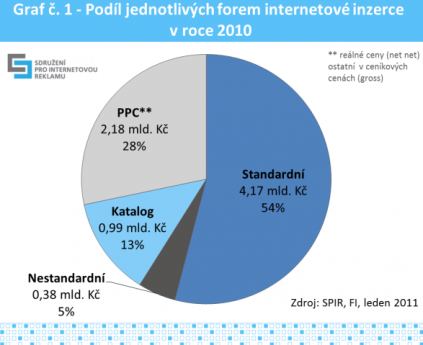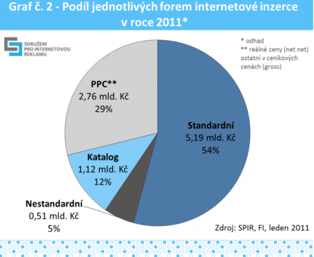 Největší objem má stále zaujímat standardní (display) reklama při odhadovaném objemu 5,19 mld. Kč a podílu 54 %. Rychleji ale roste PPC reklama, jejíž letošní podíl předpokládá SPIR na úrovni 29 %, což má představovat 2,76 mld. Kč. Na rozdíl od display reklamy je odhad reklamy PPC uváděn v čistých cenách (net net). Katalogová inzerce má letos dosáhnout 12% podílu při objemu 1,12 mld. Kč a nestandardní reklama 5% podílu (0,51 mld. Kč). Podíl jednotlivých forem internetové inzerce se tak podle odhadu v letošním roce příliš měnit nebude.