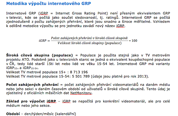 „Internetová obdoba iGRP vychází zjednodušeně z počtu zahájených přehrání videomateriálů na online médiích. Vzhledem k odlišnosti povahy obou mediatypů není přesným ekvivalentem této jednotky v televizi, avšak vyjadřuje porovnatelnou informaci. Zatímco v televizi pořad běží v reálném čase, na internetu si jej lidé mohou pustit v libovolnou dobu,“ uvádí SPIR v představení nové jednotky. Populace, ke které se iGRP vztahuje, je stejná jako v televizním měření (D15+, D15-54).
