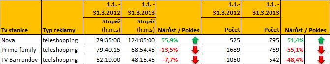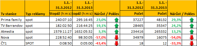 Situace na televizním trhu, která letos v prvním čtvrtletí vyústila ve vyšší počet spotů na obrazovkách TV Prima a TV Barrandov a s tím související delší stopáží reklamního vysílání na zmíněných televizích, přináší letos změnu i v jiných typech komerční televizní komunikace. Zatímco počet spotů a jejich stopáž byla v prvním letošním čtvrtletí na TV Nova nižší než loni, zvýšil se objem teleshoppingu a sponzoringu, a to zhruba o 50 %. Na obrazovkách ČT1 zase letos vzrostl o více jak 30 % sponzoring upoutávek.