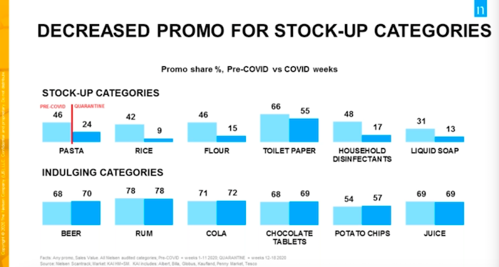 Koronavirus s sebou přinesl i snížení promočního podílu u prodeje potravin, nápojů a drogerie. Zatímco před ní se podíl tržeb z promočních aktivit pohyboval na úrovni 55,2 %, během karantény se snížil na 50,7 %, tedy na hodnotu před pěti lety. Nejvíce ubylo promocí v drogerii, kde došlo k poklesu o 12 pb, zatímco u potravin a nápojů o 3 pb. Vyplývá to z aktuálních dat výzkumné agentury Nielsen.