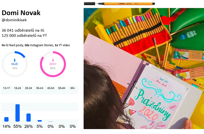 Léto a podzim jsou hlavní období prodejů značky Stabilo, prodejce psacích a kreslících potřeb. Dosud firma komunikovala především přes televizi, ovšem v letošním roce se rozhodla vyzkoušet jako hlavní médium Instagram a Youtube a výsledky ji překvapily. Celkově dosáhli za celou kampaň v ČR téměř 8 milionů impresí a zvedl se prodej konkrétního produktu o 30 %.