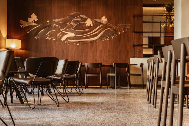 Design interiéru pracuje s ušlechtilými druhy dřeva, pohledovým betonem a mědí. Vytvářet má kosmopolitní atmosféru, jež dokresluje kulisy pro pomyslnou cestu do zapadlých koutů světa, kde se pěstují vzácné druhy kávy.