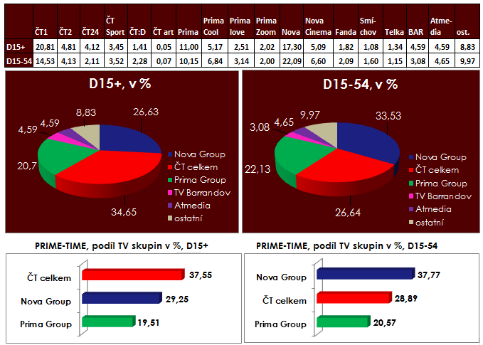 Sledovanost taneční show StarDance (ČT1) se sice s postupem do finálových kol příliš nezměnila – oproti minulému týdnu dosáhla sledovanost hlavního pořadu srovnatelných cca 1,5 mil. diváků starších 15 let – v sobotu večer byla ale v širší skupině diváků jasně nejsledovanějším pořadem. Sledovanost vzrostla samotnému závěru dalšího kola soutěže (vyhlašování), které vidělo víc než 1,6 mil. diváků starších 15 let. Díky tomu stanice České televize získaly v sobotu nejvyšší podíl v hlavním vysílacím čase, kde dosáhly na 38% podíl. Stejného výsledku dosáhla Nova Group v prime-time u mladších diváků 15-54.