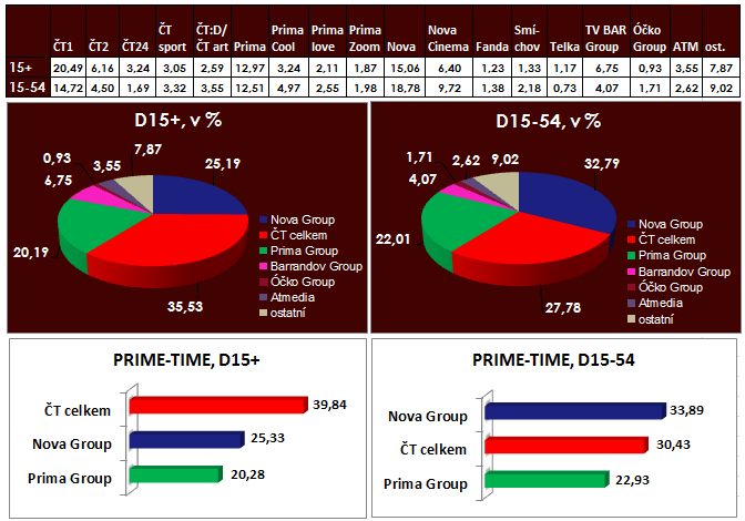 V hlavním vysílacím čase se podíl kanálů České televize v divácké skupině 15+ přiblížil k hranici 40 %, což byl jednoznačně nejlepší výsledek. V mladší skupině 15-54 dosáhla nejvyššího podílu v prime-time skupina Nova, její odstup od stanic ČT ale nebyl velký.