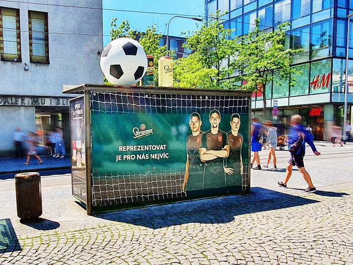 Staropramen jako jeden ze sponzorů české fotbalové reprezentace upravil zastávku MHD na pražském Andělu do fotbalové tematiky. Speciální polep, který obsahuje celopolep přístřešku včetně stropu a podlahy a stylové 3D nástavby připravila Omnicom Media Group ve spolupráci s JCDecaux. Outdoorová kampaň je součástí komunikačních aktivit Staropramenu k evropskému fotbalovému mistrovství Euro 2020. Zastávka MHD bude ve fotbalovém provedení do 12. července 2021.
