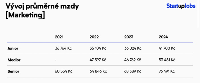 Nová data kariérního portálu StartupJobs ukazují, že mzdy v marketingovém sektoru minulý rok rostly napříč všemi senioritami. Nejvíce si oproti roku 2023 polepšily juniorní pozice. U seniorů došlo také k růstu – jejich průměrná mzda podle portálu dosahuje 76 tisíc korun.