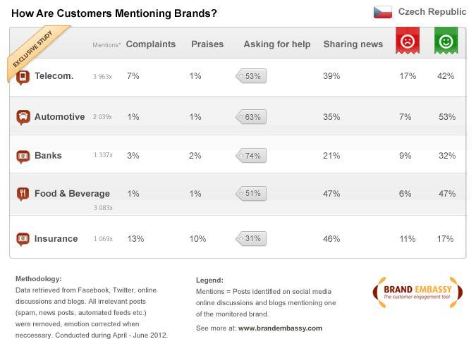 Tento malý výzkum podle společnosti Brand Embassy naznačuje, že české firmy si stále se zákaznickou péčí na sociálních sítích neví rady. A to i přes zjištění, že nejvíce zmínek o firmách na sociálních sítích, s výjimkou pojišťoven, se týká žádosti o pomoc.