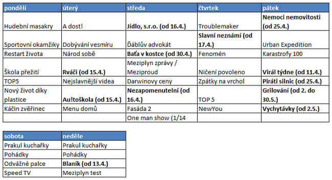 Další pořady, které se v nabídce internetové televize v průběhu jara objeví, jsou např. lifestylová reality show Zpátky na vrchol, nový pořad Restart života, tipy na nové interiérové věci s názvem Vychytávky Áji Agnerové, v pořadech Au!toškola a Nezapomenutelní využije skrytou kameru. Ve spolupráci se spoluzakladatelem serveru Tyinternety.cz Jakubem Svobodovu nabídne pořad Virály týdne a uvede také svůj první seriál, který vzniká na motivy života Tomáše Bati.