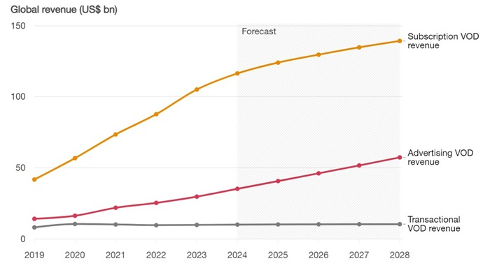 PwC proto předpokládá, že růst příjmů z předplatného (SVOD) se ustálí, a že naopak celosvětové příjmy z reklamy VOD (AVOD) do roku 2028 i nadále porostou dvouciferným tempem (CAGR ve výši 14,1 %). Do roku 2028 bude reklama tvořit asi 28 % celosvětových příjmů ze streamování, což je nárůst z 20 % oproti roku 2023.