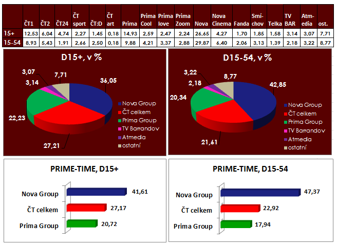 Středeční televizní večer nejlépe vyšel seriálu Doktoři z Počátků (Nova), který jako jediný dosáhl vyšší sledovanosti než milion diváků starších 15 let (1,12 mil.). Před druhým pořadem večera, seriálem Cesty domů (Prima), měl téměř dvojnásobný náskok. To skupině Nova přineslo nejvyšší podíl v prime-time v obou sledovaných cílových skupinách.