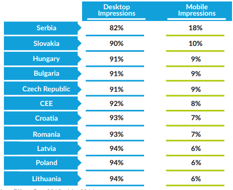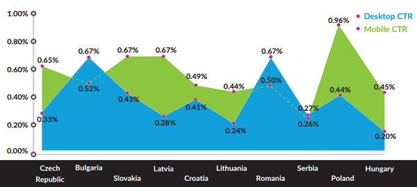 Průměrná míra prokliku (CTR) je podle studie ve většině zemí vyšší při používání mobilních zařízení – konkrétně v Česku měla představovat v případě mobilních zařízení 0,65 %, zatímco v případě PC 0,33 %. Objem mobilní reklamy je ale teprve na vzestupu: pouze 8 % impresí v regionu CEE se zobrazuje na mobilních zařízeních, v Česku podíl impresí je o něco vyšší než průměr celého regionu (9 %).