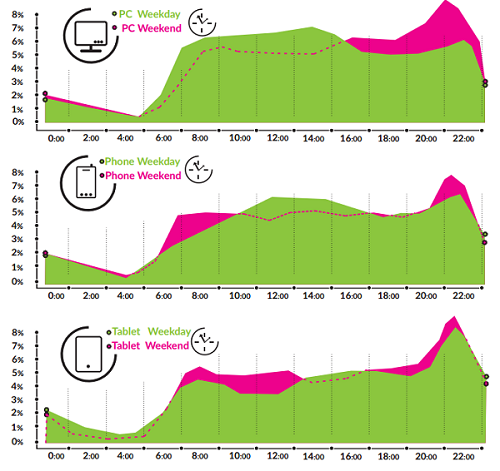 Internetoví uživatelé v regionu CEE používají pro surfování na internetu spíše chytré telefony než tablety. Klasické počítače se používají nejvíce v pracovní dny od rána do 15 hodin (zaměstnání, školy) s vrcholem kolem 13. hodiny, o víkendech pak spíše odpoledne a večer (15 – 22 hod.). Tablety a chytré telefony se používají více o víkendech, a to po celý den.