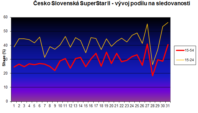 Druhá řada talentové reality show Česko Slovenská Superstar pomalu spěje k poslednímu finálovému kolu a postupem času se vylepšuje i sledovanost pořadu. Zatímco zájem diváků o úvodní kola se z pohledu podílu v cílové skupině 15-54 let pohyboval na úrovni 25 %, poslední nedělní přenos 22. května se vyšplhal na 40,6 %.