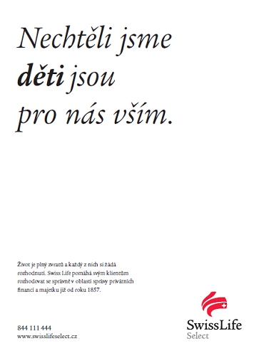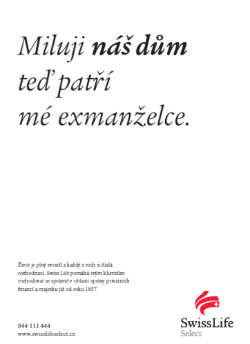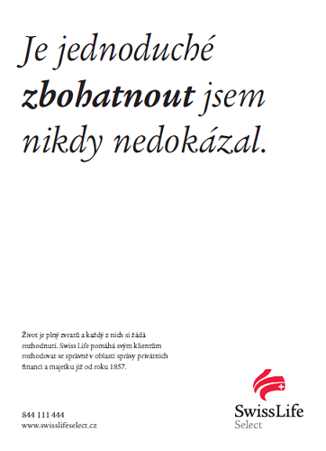 Finanční skupina Swiss Life, která poskytuje finanční poradenství především pro bonitní klientelu, přivedla do Česka svoji kampaň postavenou na konceptu „zlomových vět“. Ta už byla k vidění na klíčových trzích společnosti, zejména ve Švýcarsku. Kampaň v letošním roce získala několik ocenění na mezinárodních reklamních festivalech včetně stříbra z Cannes Lions.