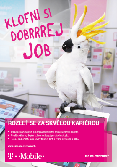 T-Mobile spouští náborovou kampaň k získání pracovníků na pobočky. Hlavním hrdinou je veselý papoušek, který se postupně objeví v outdooru, printu a online, kde bude glosovat benefity zaměstnání v T-Mobile a lákat potenciální zájemce, aby si „klofli dobrej job”.