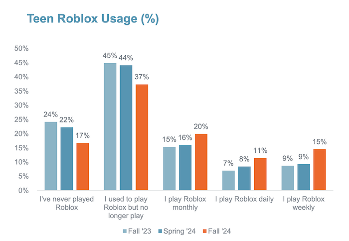 Za posledních šest měsíců vzrostlo také aktivní využívání Robloxu, které se zvýšilo o 12 pb. na 46 %. Zároveň klesl podíl těch, kteří na něm nikdy nehráli (17 %, od jara -5pb).