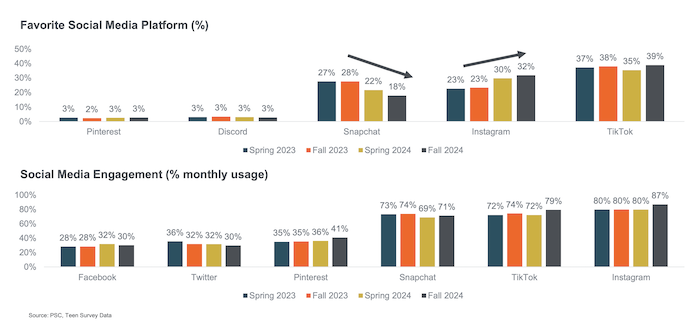 Instagram dnes užívá 87 % dospívajících, což je od posledního jarního průzkumu o 7 pb. více. TikTok používá 79 % z nich, tedy o 7 pb. více než před půl rokem. Mírně vyrostl i Snapchat, který je se 71 % na třetím místě. Většího zájmu se nyní těší také Pinterest (41 %), jenž vzrostl o 5 pb. Naopak sítě X (dříve známá jako Twitter) a Facebook poklesly o 2 pb. na 30 %.