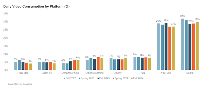 Ze zmíněného průzkumu také vyplývá, že u sledování videí na denní bázi vede u dospívajících mírně Netflix (30 %) před YouTube (27 %). Za nimi jsou poté s velkým odstupem Hulu (7 %), Disney+ (7 %), Amazon Prime (4 %) a HBO Max (4 %).