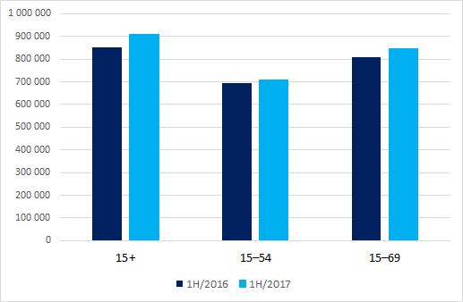 Za období prvního letošního pololetí odvysílaly tuzemské televizní stanice více reklamních TRP (target rating point) než ve stejném období loňského roku. Navýšení je patrné především v divácké skupině starší 15 let (+9 %) a také v divácké skupině 15-69 (+7 %), naopak v mladší skupině 15-54 je navýšení nejnižší (+2 %). Podíl na doručených TRP ale nemusí odpovídat podílu, které jednotlivé televizní subjekty mají na tržbách z prodeje reklamního prostoru.