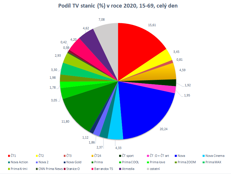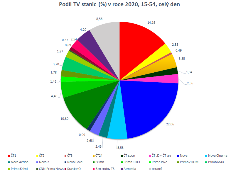 Skupina Nova zůstává nejsilnější v diváckých skupinách 15-54 a 15-69 v celodenním vysílání a také v hlavním vysílacím čase ve všech sledovaných diváckých kategoriích. Oproti roku 2019 ve své hlavní skupině 15-54 snížila podíl o více než jeden procentní bod (celodenní vysílání) a o půl procentního bodu v hlavním vysílacím čase.