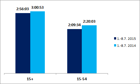 Průměrná doba, kterou diváci před televizními obrazovkami v letošních prvních červencových dnech (1.-8.7. 2015) strávili, je o zhruba pět minut kratší než ve stejném loňském období (platí pro skupinu 15+) a představovala necelé tři hodiny denně. V mladší cílové skupině 15-54 je průměrná doba sledování o cca deset minut kratší než na začátku léta 2014 s denním průměrem nad dvě hodiny.