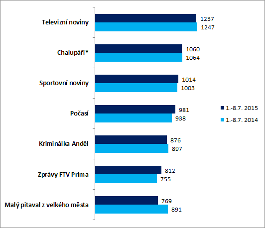 Žebříček nejsledovanějších letních pořadů v období 1.-8. července 2015 je ovlivněn tím, že seriál Chalupáři, nejsledovanější seriál loňského léta, začal letos na obrazovkách televize Nova dříve než v loňském létě. Letošní uvedení v neděli 22. června 2015 sledovalo víc než milion diváků, červencový díl tohoto víkendu ale vlivem prodlouženého víkendu a tropických teplot klesl na 655 tisíc. Do srovnání jsme proto zařadili první díl seriálu Chalupáři vysílaný letos (22. 6.) a loni (10. 7.).