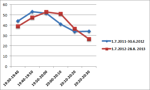 Efektem prodloužení zpravodajské relace bylo získání televizních diváků bezprostředně po 20. hodině. Jak ukazuje následující rozfázování hodiny vysílání od 19:30 do 20:30 po deseti minutách, v destiminutovce od 20:00-20:10 došlo k navýšení podílu Televizních novin. To v divácké skupině 15-54 znamenalo nárůst počtu diváků o cca 100 tisíc oproti stavu před prodloužením stopáže (1.7. 2011-30.6. 2012).