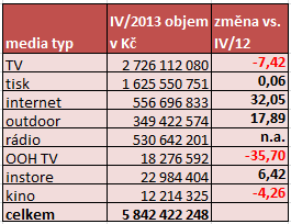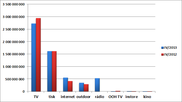 V procentuálním srovnání jde o snížení na úrovni 7 %, což znamená, že se ztráty z počátku roku (leden, únor – pokles o 17 %) podařilo částečně snížit. Přesto televize zůstává mediatypem, který v letošním roce v hrubých monitorovaných obratech klesá nejvíce z rozhodujících médií (tj. TV, tisk, internet, rádio, outdoor).