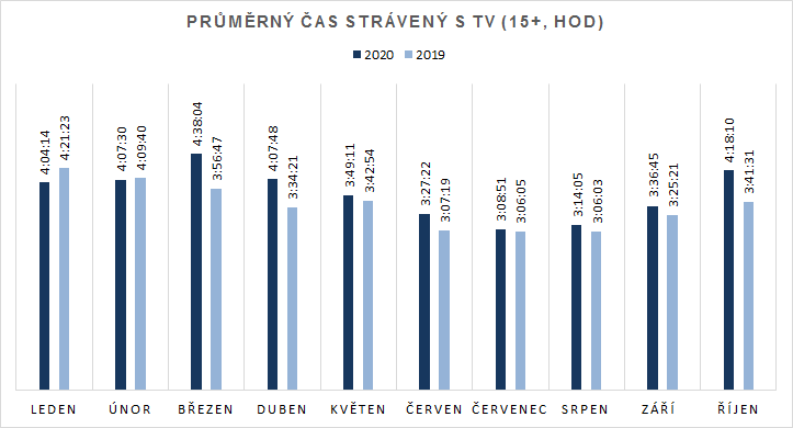 Průměrný čas sledovanosti televize za celý měsíc říjen 2020 pak představoval 4 hodiny a 18 minut denně, což bylo zhruba o 37 minut víc než v loňském říjnu. Jak ukazuje graf níže, lidé v letošním roce tráví před obrazovkou víc času téměř v každém letošním měsíci. Platí to především od března do října, kdy v každém z těchto měsíců byl průměrný čas vyšší než ve stejných měsících loňského roku. Vyšší rozdíly jsou pak zřetelné na jaře (březen, duben) a na podzim (říjen), kdy byl průměrný čas sledování výrazněji vyšší než v loňských stejných měsících. Souvisí to s nástupy první a druhé vlny pandemie covid-19.