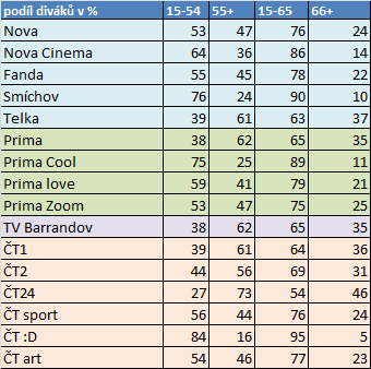 U starších dětí 10-14 let si vede nadprůměrně Prima Cool a už zmíněné stanice Atmedia. Rovněž diváci 15-24 oproti průměru volí Primu Cool, která je v této skupině druhou nejsilnější po hlavním kanálu skupiny Nova. Nadprůměrně si v této skupině vede i filmový Nova Cinema. Hlavní kanál Novy si udržuje nadprůměrný podíl na sledovanosti i v cílových skupinách 25-34 a 35-44 let. Ve skupinách diváků starších 55 let a 65 let mají oproti svému průměru vyšší podíly na sledovanosti kanály ČT1, ČT24 hlavní kanál skupiny Prima, TV Barrandov a Telka.