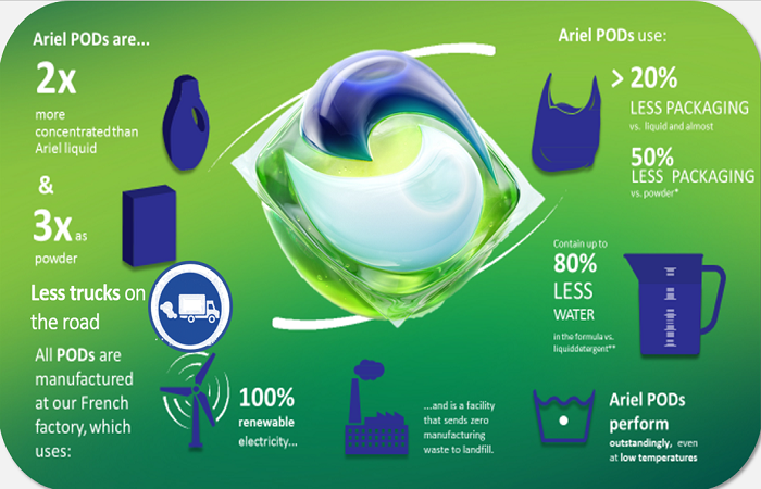 Prací prostředek Ariel přišel od roku 2018 s řadou změn, kdy se například díky balení v sáčcích místo plastových krabiček se ušetřilo 75 % plastů anebo díky lehkému uzávěru se ušetřilo 3400 tun plastu. Například u Lenoru obsahuje obal o polovinu méně PCR a Ariel kapsle se vyrábějí ve Francii v továrně, která funguje na bázi obnovitelných zdrojů energie.