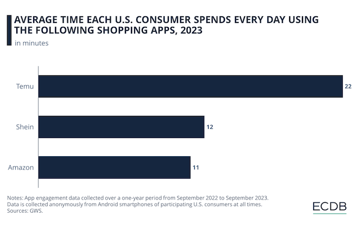 Ještě zajímavější je schopnost Temu.com udržet pozornost svých návštěvníků. Kromě široké nabídky jim totiž nabízí gamifikovanou online nákupní zkušenost, která lidi udržuje na stránkách či v aplikaci déle, než se to daří jiným stránkám. Podle pozorování společnosti GWS, jež sleduje činnost uživatelů chytrých telefonů Android 24 hodin denně, je průměrný čas strávený na Temu 22 minut denně, zatímco na Amazonu pouze 11 minut, na Shein 12 minut.