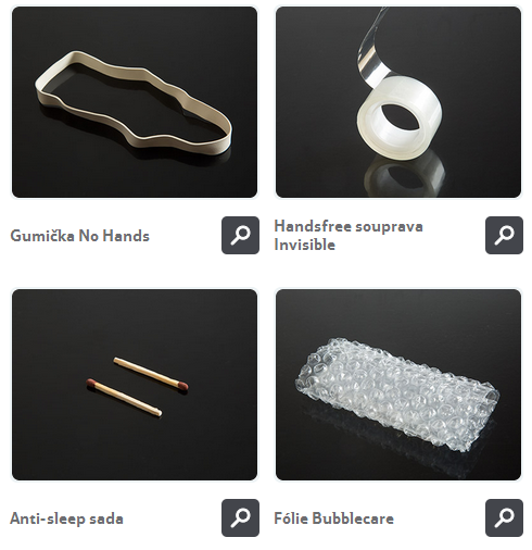 V nabídce je celkem osm produktům: gumička No Hands, lepicí páska Invisible, ochranná pokrývka Rainprotekt, ochranný sáček iGelit, sada sirek Anti-sleep, bublinková fólie Bubblecare, bezpečnostní houbička Forehead a tyčinka do uší Soundstick. U vychytávek je i praktický návod k použití. K objednaným vychytávkám přidává společnost i SIM kartu v hodnotě 150 korun zdarma.