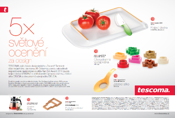 Společnost Tescoma letos získala tři světová ocenění Red Dot Design Awards, jež se udělují v německém Essenu. Nejvyšší ocenění Red Dot Design Award Winner 2014 dostala za krájecí desku Vitamino s antibakteriální úpravou povrchu.