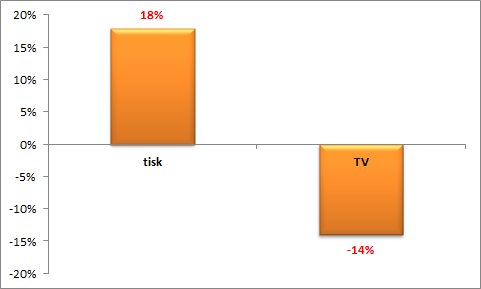U největších 50 zadavatelů došlo v prvních pěti letošních měsících ke snížení investic do televizní reklamy o cca 14 %, což představuje snížení o téměř 850 mil. Kč. Investice do tiskové reklamy se v případě prvních padesáti zadavatelů letos ve stejném období souhrnně navýšily o 18 %, tj. necelých 220 mil. Kč.