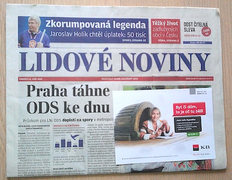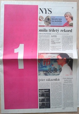 Vedle celostránkových přebalů pronikly na titulní strany českých deníků i stickery, které překrývají část redakčního textu a které po odlepení fungují podobně jako letáky.