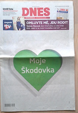 Možnost plné inzerce na titulní straně opakovaně využila automobilka Škoda se zeleným srdcem, odkazujícím k nákupu “nové lásky”.