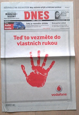 Průlomem byl v tomto směru jistě rok 2006, kdy tuzemské deníky “podlehly” inzertnímu tlaku a potřebě zvyšovat inzertní obraty. Otisk červené dlaně, který zaplnil celou inzertní stranu, symbolizoval příchod společnosti Vodafone, která v té době nahrazovala značku Oskar. Přebal s červenou rukou obsadil titulní strany všech celostátních zpravodajských deníků.
