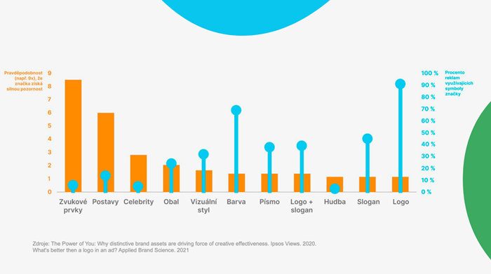 To, že si značka má stanovit a následně konzistentně využívat vlastní jedinečné znaky rozpoznatelnosti, tzv. distinctive brand assets, je lekce ze základů marketingu. Robert Čížek, stratég pořadatelské agentury Taste, se na práci s nimi na nedávné konferenci Brand Restart podíval podrobněji. Připomněl, že mají moc zvyšovat účinnost kreativy a propojovat komunikační kanály. A ukázal graf vycházející z nedávné studie agentury Ipsos. Znázorňuje, jak často značky využívají jednotlivé vizuální nebo zvukové prvky jako distinktivní znaky a jak jsou tyto prvky efektivní. Ilustruje tak přeceňovanost nebo naopak skrytý a nevyužitý potenciál některých z nich.