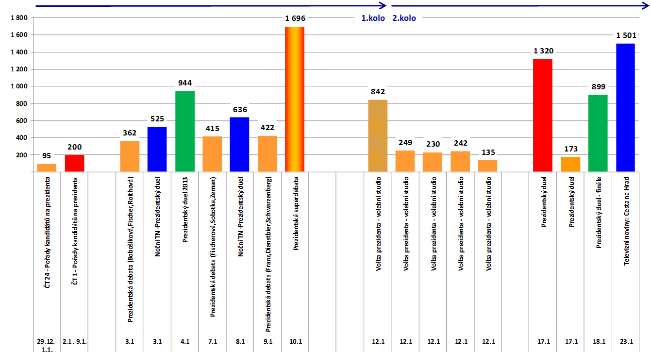 Vůbec nejsledovanějším diskusním pořadem za účasti kandidátů na prezidenta před prvním a druhým kolem volby byla Prezidentská superdebata ve čtvrtek 10.1. na ČT, kterou na kanálech ČT1 a ČT24 v průměru dohromady zhlédlo 1,7 mil. diváků starších 15 let.