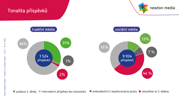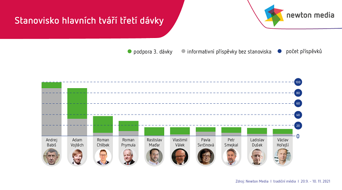 Skoro třetina příspěvků zveřejněných v tradičních médiích vyznívala vůči podávání třetí dávky pozitivně. „Nejčastěji zaznívaly pozitivní postoje z úst ministra zdravotnictví Adama Vojtěcha nebo předsedy České vakcinologické společnosti Romana Chlíbka. Nejvíce redakčního obsahu bylo však věnováno Andreji Babišovi, který se po aplikaci třetí dávky stal pro média jakýmsi symbolem již podstoupeného přeočkování,“ říká Ondřej Polivka, analytik Newton Media. Naproti tomu kritický nebo nejednoznačný postoj vůči třetí dávce byl v tradičních médiích zastoupen jen v 3 % článků. „Opatrný postoj k podávání třetí dávky vyjadřovala hlavně šéfka pražské laboratoře Synlab Anabela Čížková, lékař Martin Balík nebo imunoložka Jiřina Bartůňková. Veškeré zcela odmítavé postoje zazněly ve sledovaném období na webu parlamentní listy.cz, kde mezi hlavní kritiky třetí dávky patřili imunoložka Zuzana Krátká, Roman Šmucler, Robert Fico, Lukáš Pollert, Jan Hnízdil a předseda ČLK ve Zlíně Jaromír Bernátek,“ doplňuje Polivka.