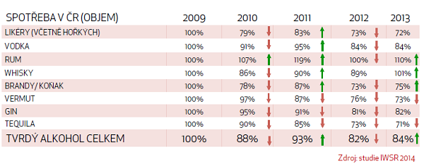 Konzumace relativně levnějších nápojů klesá, konzumace dražšího alkoholu stagnuje nebo mírně roste.