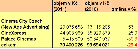 I přesto, že oba hlavní hráči v segmentu kinoreklamy své příjmy oproti loňsku zvýšily, meziročně se trh snížil o cca 30 milionů Kč. Největší díl těchto investic chybí právě u Palace Cinemas.