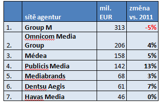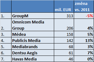 Ve srovnání s rokem 2011 si polepšila většina vlastníků mediálních agentur, nejvíce přitom síť Publicis (+13 %), což souvisí s rozšířením portfolia o klienta Telefónica O2. Agentury Publicisu se tak přiblížily k třetí Médee.