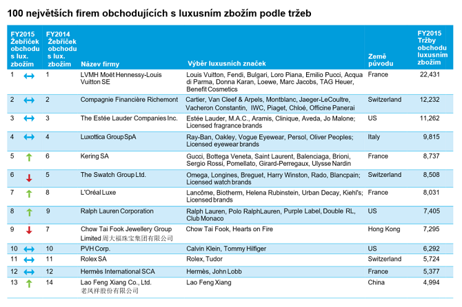 Podle hlavního ekonoma společnosti Deloitte Davida Marka je ale meziroční srovnání ovlivněno výjimečným výdělkem společnosti LVMH z prodeje akcií Hermès v objemu 2,8 miliard dolarů z předešlého fiskálního roku. „Nebýt toho, byly by výsledky obou let téměř shodné,“ vysvětlil. V žebříčku sestaveném podle tržeb zaujímá právě LVMH (Louis Vuitton, Fendi, Bulgrai aj.) první místo.